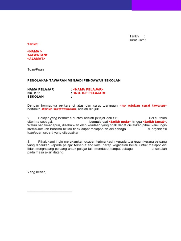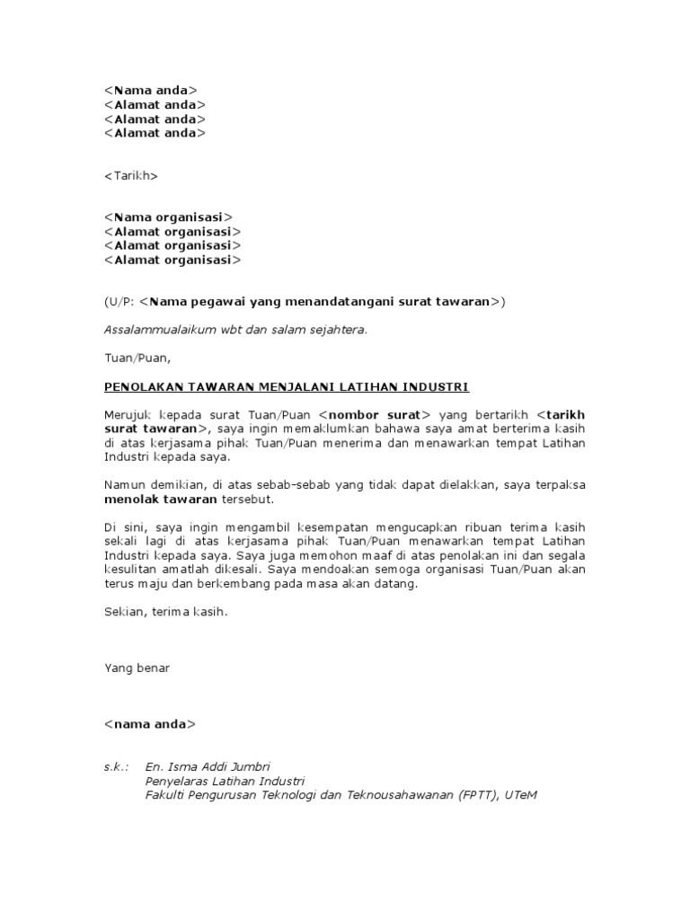 Related : Contoh Surat Penolakan Tawaran / Contoh surat penolakan pekerjaan # 1..